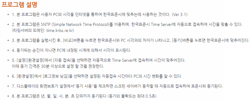위 프로그램도 어쨌든 서버와 통신을 해서 정보를 받아와야 하므로, 운영체제의 네트워크 모듈을 사용할 것입니다. 역시나 utck 주요기능 페이지에는 이와 같은 내용이 설명되어 있었습니다. KRISS의 설명에 따르면 SNTP 프로토콜을 이용해 시간 정보를 받아온다고 합니다.