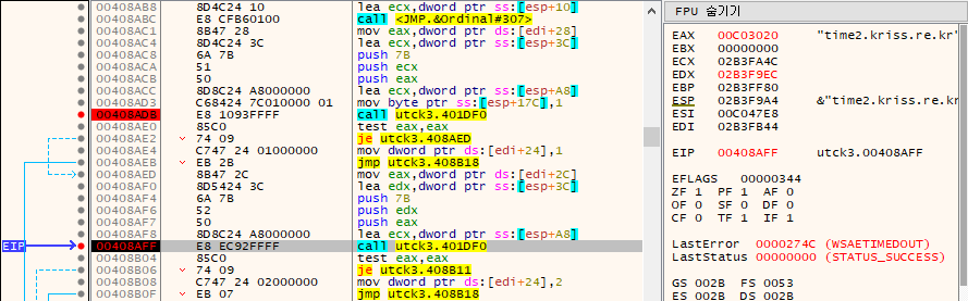 그렇다면 이 함수를 부르는 부분을 찾으면 될 것입니다. 이 부분에서 드디어 제가 원하는 정보를 찾을 수 있었습니다. 잭팟입니다. 여기서는 저희가 원하는 값이 코드에 들어있는 것이 아니고 함수의 호출 과정을 따라서 쭉 인자가 전달되는 것으로 보였습니다. 그래서 코드 안에서 원하는 정보를 얻지는 못하고 x32dbp라는 프로그램을 이용해 아래 부분의 함수 호출부에 break를 걸고 확인해보았습니다. 그랬더니 함수 인자로 time.kriss.re.kr과 time2.kriss.re.kr를 각각 주는 것을 확인하였습니다.