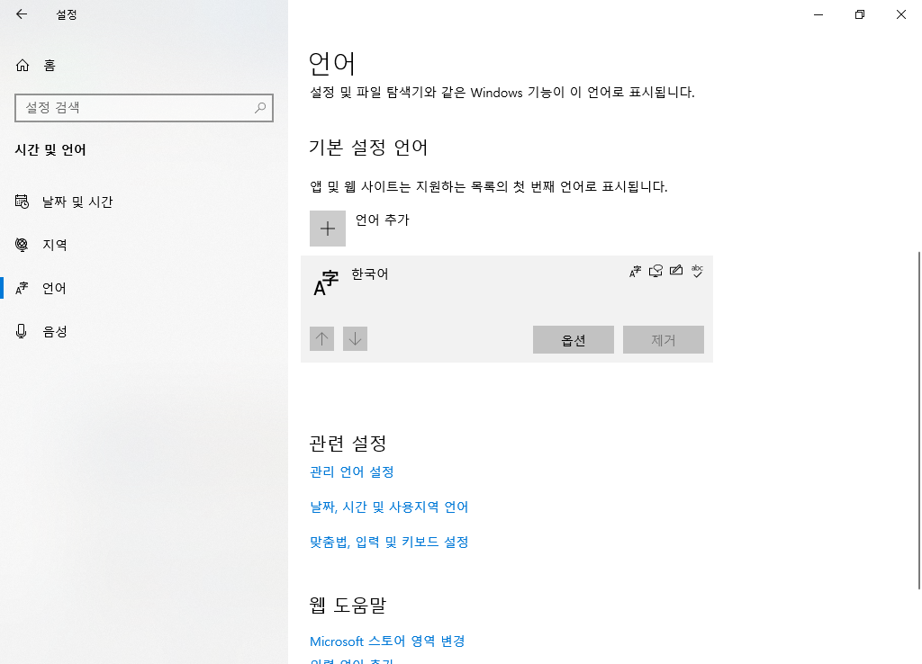 그 다음에 [시간 및 언어] 탭으로 이동한다. 그 후에는 아래와 같이 왼쪽의 [언어] 탭으로 이동한다.