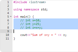 그 다음 스크린샷은 필자가 자주 사용하는 jdoodle.com이라는 온라인으로 즉석으로 코드를 실행해볼 수 있는 서비스이다. 해당 서비스에서는 간단한 텍스트 입력기를 제공한다. 코드 텍스트 편집기는 대부분 주석 처리 기능을 제공하는데, 아래의 경우에도 Ctrl + / 를 입력하면 하이라이트된 줄이 주석 처리된다.