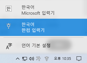 그런데 아무리 검색해도 결과가 나오지 않는 것이었다. 이 때부터 조금 이상했다. 우리나라 뿐만 아니라, 전세계적으로 사용하는 운영체제인 윈도우 10과 관련된 문제인데 이렇게 자료가 없다는 것부터가 굉장히 이상한 부분이었다. 그러다가 윈도우 IME와 관련된 논의를 보게 되었다. 혹시 내 컴퓨터의 IME 문제인가라는 생각과 함께 화면 오른쪽 밑의 작업표시줄 알림영역의 입력기 관련된 메뉴를 여는 순간...