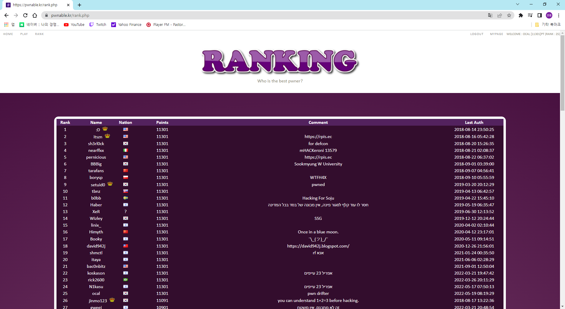 본인 앞에 이미 수많은 분들이 이미 완주를 하고 떠났었다. 역시 취약점에 대해 다루는 사이트이다 보니 문제의 취약점에 대해 제보하신 분들이 많고, 시스템 자체의 취약점에 대한 부분들에 제보하신 분들도 계신다. 현재 랭킹 상단에 안 계신 분들이 많은 것으로 봐서는 완주하고 사이트에 방문한 지 오래되었는데 문제가 업데이트되면서 랭킹이 바뀐 것이 아닐까 싶다.
