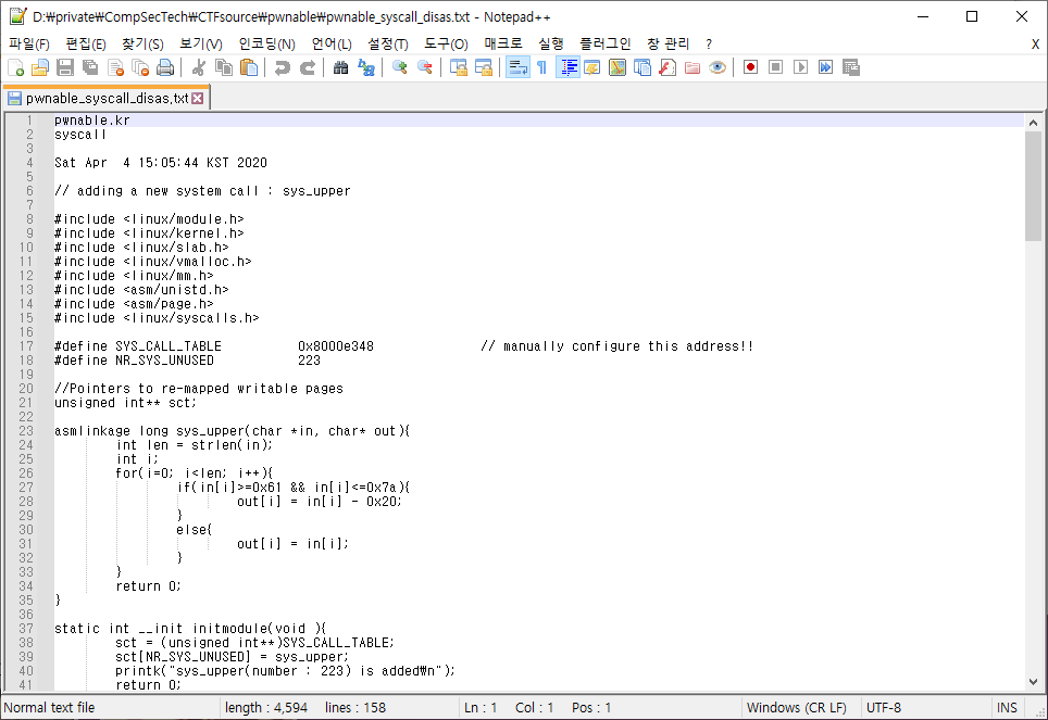 본인은 사진에 보이는 것처럼 챌린지를 풀 때마다 기록해놓았다. 이 사이트 문제를 풀기 시작한 게 이 블로그 개설하기 이전이라서 그냥 메모장으로 기록을 했다. 맨 처음부터 기록을 한 건 아니고, 지금 보니까 Rookiss의 syscall 문제부터 기록이 되어있다.