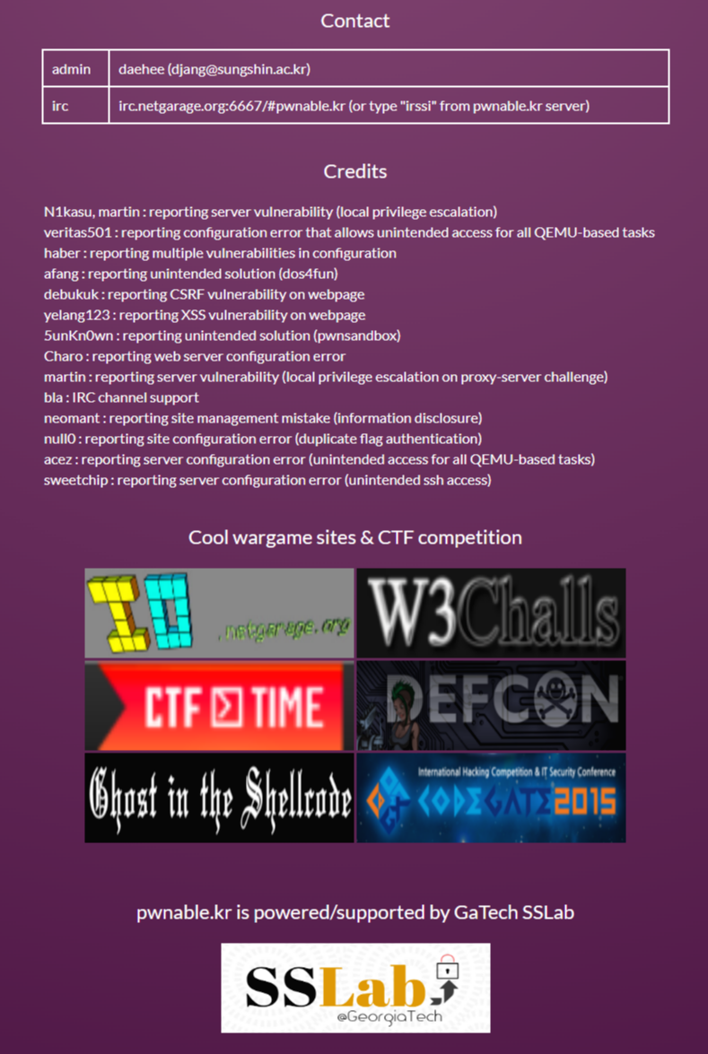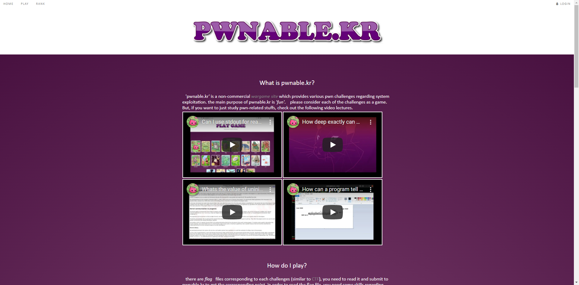 pwnable.kr은 장대희 교수(현 성신여대)님이 (아마도) 대학원 시절에 만든 사이트이다. 컴퓨터 기술이 빨리 바뀌고 업데이트되는 것에 비하면 꽤 오래된 사이트라고 할 수도 있을 것 같다.
