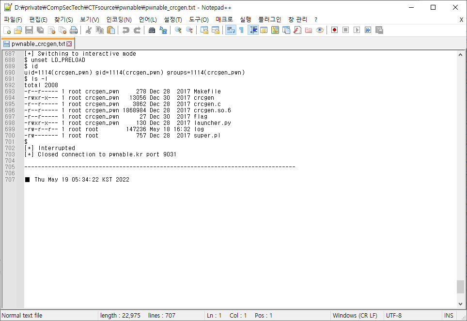 이틀 전 2022년 5월 19일 새벽 5시 34분 KST에 마지막 pwnable.kr 챌린지인 crcgen을 완료했다.